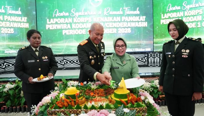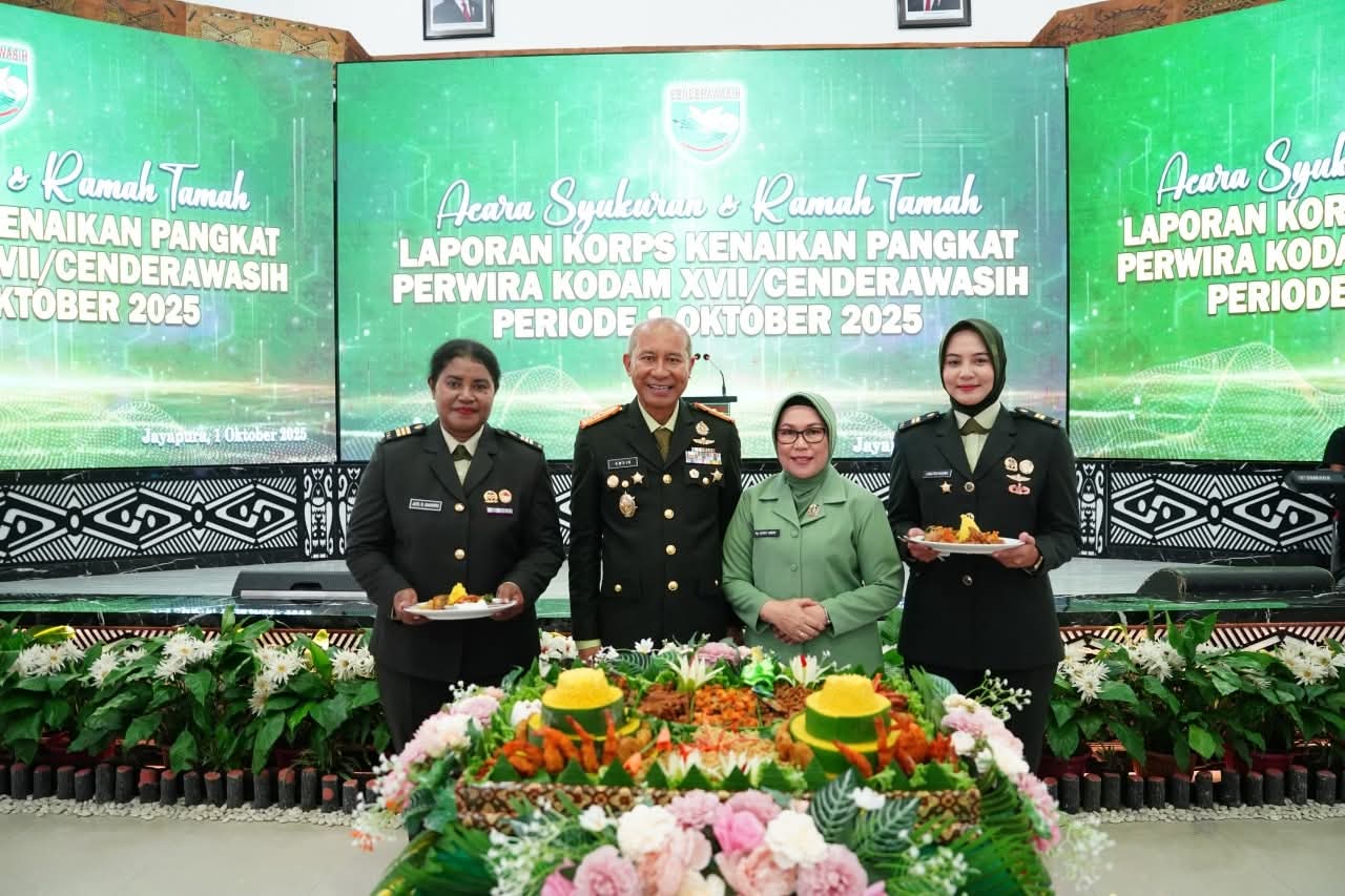 Sebagai bentuk rasa syukur, Pangdam bersama Ketua Persit KCK Daerah XVII/Cenderawasih memotong tumpeng dan menyerahkannya kepada Kapten Caj Jois Robeka Gasperz (Kasetum Korem 172/PWY), perwakilan Kowad asal Sarmi, Papua yang turut memperoleh kenaikan pangkat.