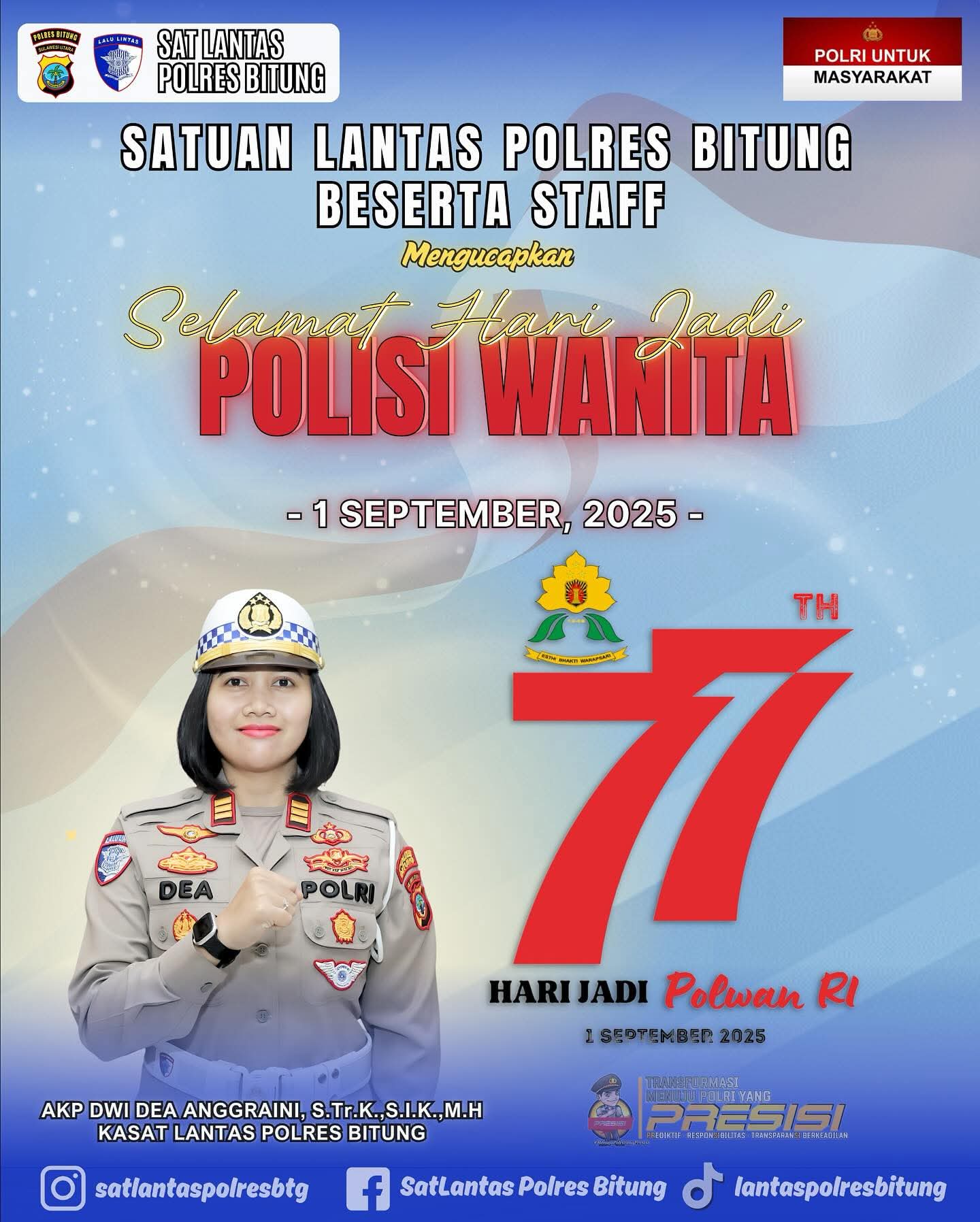 SuaraIntelijen.com.BitungSatuan Lalu Lintas (Satlantas) Polres Bitung beserta seluruh jajarannya mengucapkan selamat Hari Jadi Polisi Wanita (Polwan) ke-77 yang diperingati setiap 1 September.