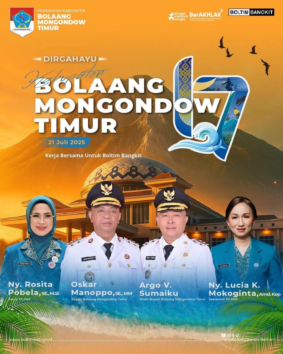 SuaraIntelijen.com.Boltim,Bupati Bolaang Mongondow Timur (Boltim), Ir. Oskar Manoppo, M.M., dan Wakil Bupati Argo V. Sumaiko, S.Pd., M.AP., menyampaikan ucapan selamat Dirgahayu ke-17 Kabupaten Bolaang Mongondow Timur, yang diperingati pada Senin, 21 Juli 2025.