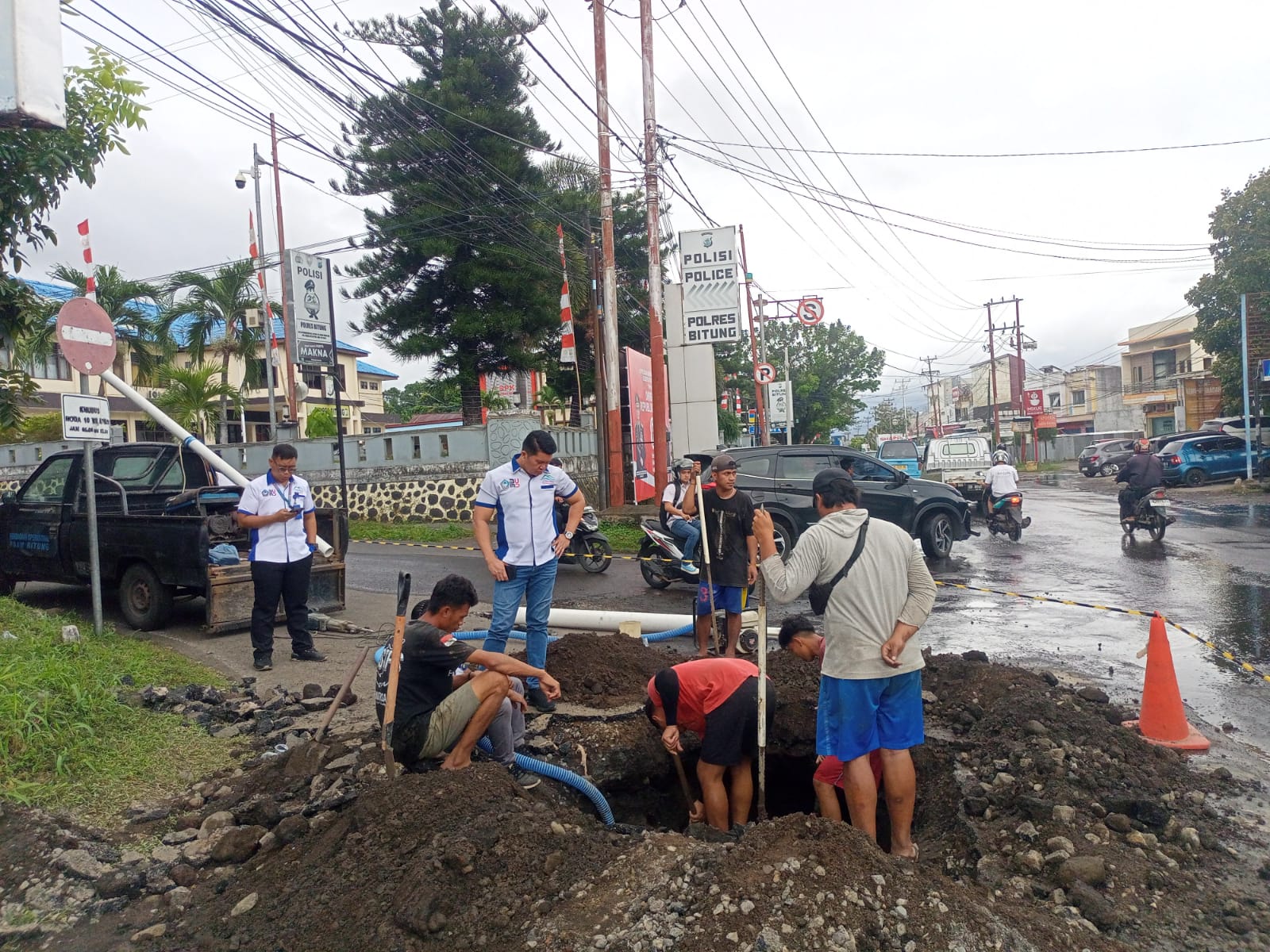 SuaraIntelijen.com.Bitung,Direktur Utama Perumda Air Minum Duasaudara Alfred Salindeho SE MM, turun langsung meninjau perbaikan pipa air yang mengalami kebocoran di samping Polres Bitung, Kelurahan Girian Weru 2, Kecamatan Girian, Kota Bitung, pada Selasa (19/8/2025).