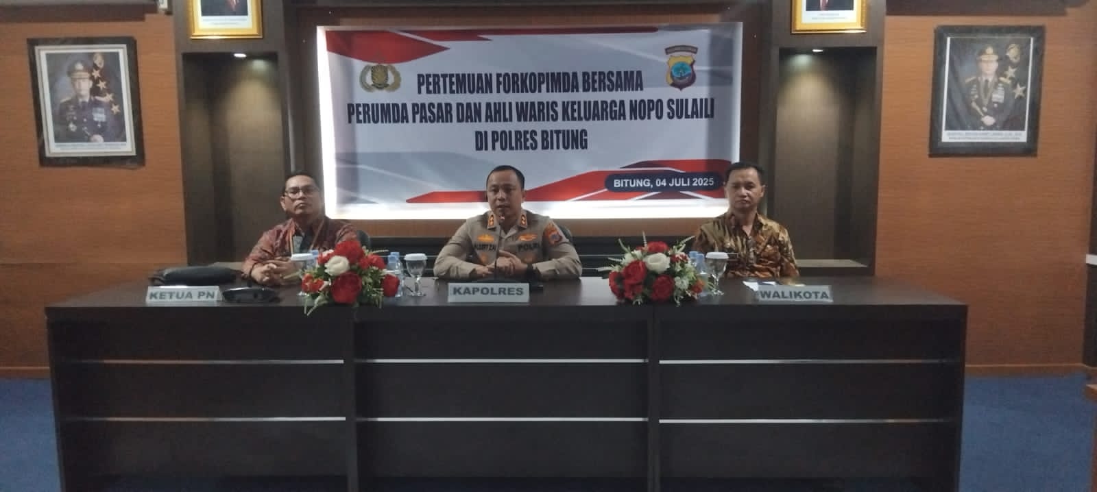 SuaraIntelijen.com.Bitung,Forum Komunikasi Pimpinan Daerah (Forkopimda) Kota Bitung menggelar pertemuan penting guna mencari solusi terbaik atas konflik kepemilikan lahan di Pasar Girian. Pertemuan dilaksanakan di Aula Endra Dharmalaksana (ED) Polres Bitung pada Jumat, 4 Juli 2025, dipimpin langsung oleh Kapolres Bitung, AKBP Albert Zai, S.I.K., M.H.