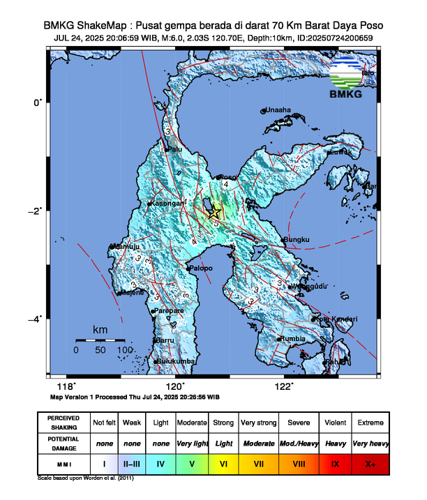 MMI III: Palu, Mamuju, Pasangkayu, Palopo (getaran dirasakan dalam ruangan, seperti truk melintas).