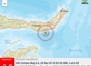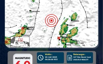 SuaraIntelijen.com.Gorontalo,Wilayah Pohuwato, Provinsi Gorontalo diguncang gempa bumi tektonik pada Kamis, 24 Juli 2025 pukul 03.50 WIB. Berdasarkan hasil analisis Badan Meteorologi, Klimatologi, dan Geofisika (BMKG), gempa ini memiliki parameter update dengan magnitudo M6,4. Episenter gempa terletak di koordinat 0,51° Lintang Utara dan 122,05° Bujur Timur, tepatnya di darat wilayah Pohuwato pada kedalaman 135 kilometer.