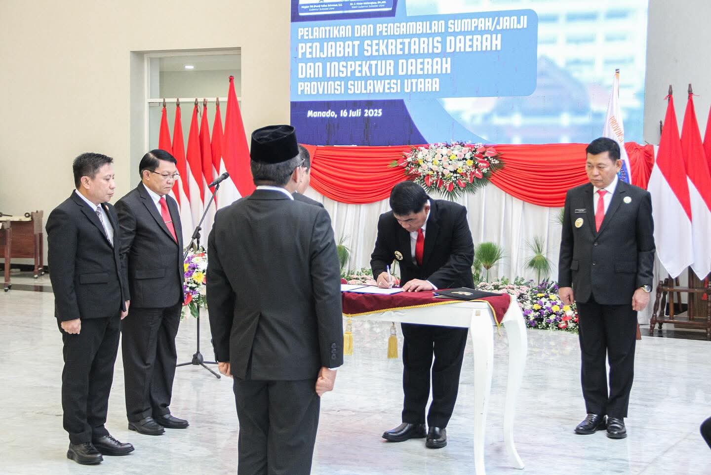 SuaraIntelijen.com.Manado,Gubernur Sulawesi Utara kembali menegaskan pentingnya kekompakan seluruh elemen pemerintahan dalam mewujudkan visi dan misi pembangunan daerah. Hal ini disampaikan dalam acara pelantikan dua pejabat tinggi pratama Provinsi Sulut, yakni Pj. Sekretaris Provinsi (Sekprov) Tahlis Gallang, S.I.P., M.M. dan Inspektur Daerah Dr. Jemmy Stani Kumendong, M.Si., di Wisma Negara Bumi Beringin, Manado, Rabu (16/7/2025).