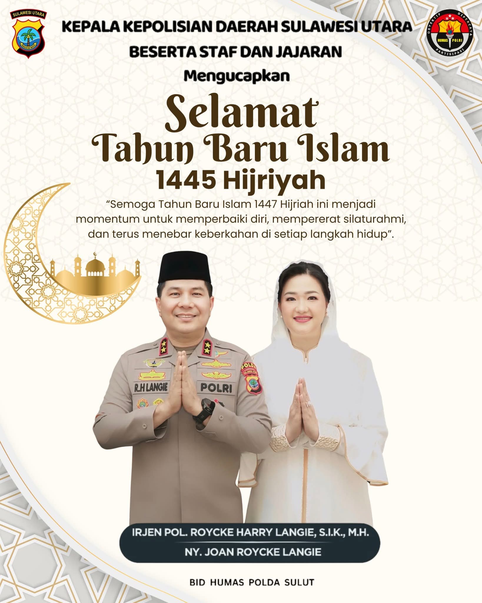 “Saya, Irjen Pol Roycke Harry Langie, Kapolda Sulawesi Utara, mengucapkan Selamat Tahun Baru Islam 1 Muharram 1447 Hijriah. Semoga momen ini membawa keberkahan, keselamatan, dan semangat hijrah menuju kehidupan yang lebih baik bagi kita semua,” ucap Kapolda dalam keterangannya, Kamis pagi.