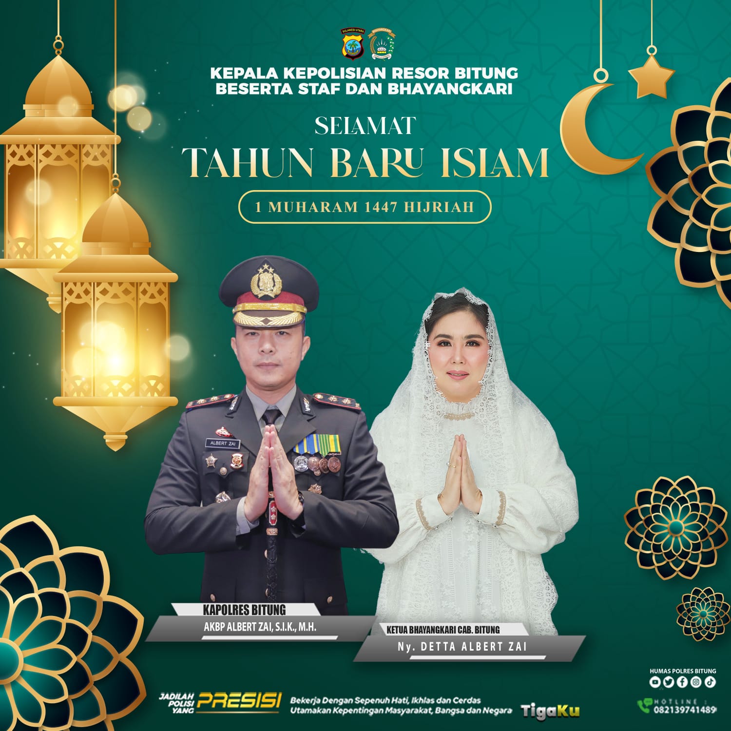 “Saya, AKBP Albert Zai, selaku Kapolres Bitung, mengucapkan Selamat Tahun Baru Islam 1 Muharram 1447 Hijriah. Semoga tahun baru ini membawa keberkahan, kedamaian, dan semangat hijrah ke arah yang lebih baik bagi kita semua,” ucapnya, Jumat (27/6/2025).