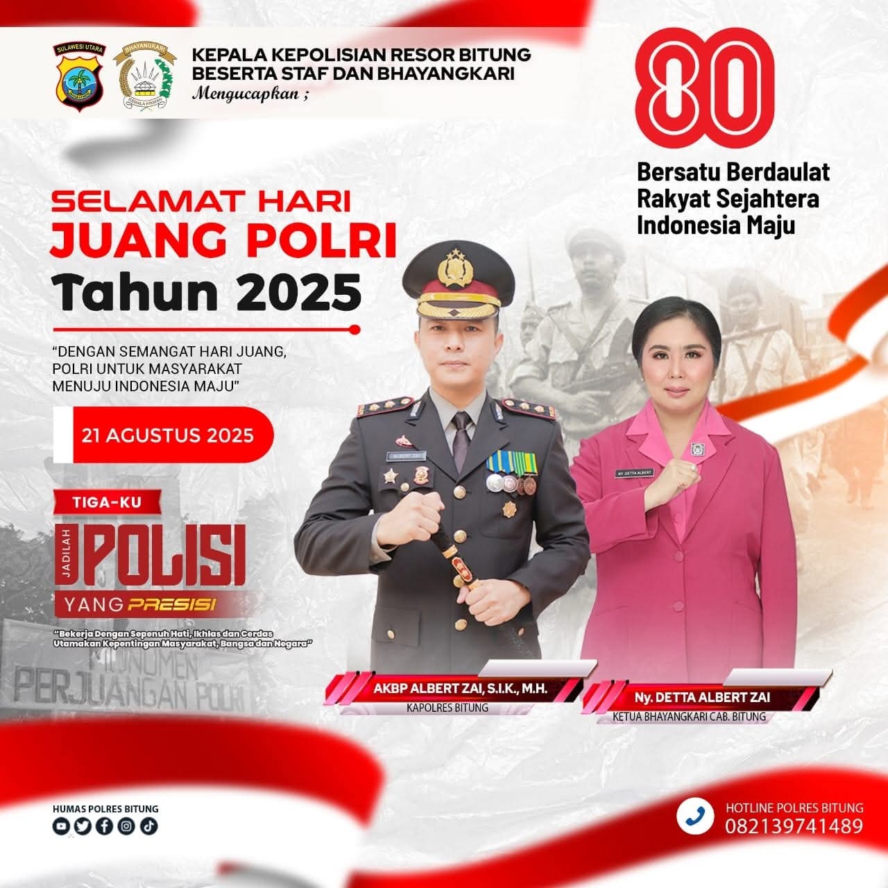 SuaraIntelijen.com.Bitung,Kapolres Bitung, AKBP Albert Zai, S.I.K., M.H., bersama Ketua Bhayangkari Cabang Bitung, Ny. Detta Albert Zai, beserta staf dan jajaran, menyampaikan ucapan selamat memperingati Hari Juang Polri tahun 2025, Kamis (21/8/2025).