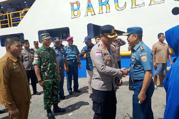 SuaraIntelijen.com.Talaud,Kapolres Kepulauan Talaud AKBP Arie Sulistyo Nugroho dan Ketua Bhayangkari Cabang Kepulauan Talaud Ny. Hikma Arie Sulistyo bersama Forkopimda, menjemput kedatangan pejabat baru Danlanal Melonguane Letkol Laut (P) Yogie Kuswara, di Pelabuhan Melonguane, Selasa (29/4/2025) pagi.