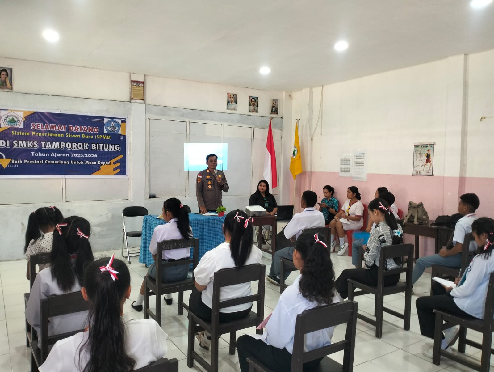 SuaraIntelijen.com.Bitung,Dalam upaya menekan angka kenakalan remaja dan meningkatkan kesadaran akan pentingnya ketahanan pribadi serta keamanan lingkungan, Kapolsek Maesa AKP Ferry Padama, S.H., menggelar kegiatan penyuluhan di SMK Tamporok Bitung, Kamis (10/7/2025).