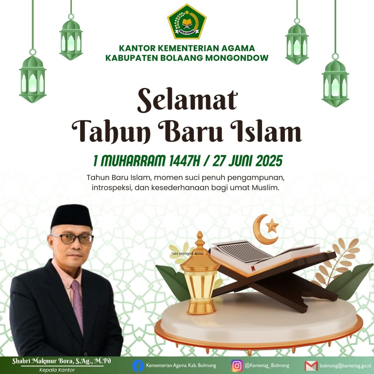 SuaraIntelijen.com.Bolaang Mongondow,Memperingati 1 Muharam 1447 Hijriah, Kantor Kementerian Agama (Kemenag) Kabupaten Bolaang Mongondow Shabri Makmur Bora S.ag Mpd menyampaikan pesan dan harapan kepada seluruh umat Muslim agar menjadikan Tahun Baru Islam sebagai momen suci yang sarat makna spiritual.Jumat,(27/6/2025).
