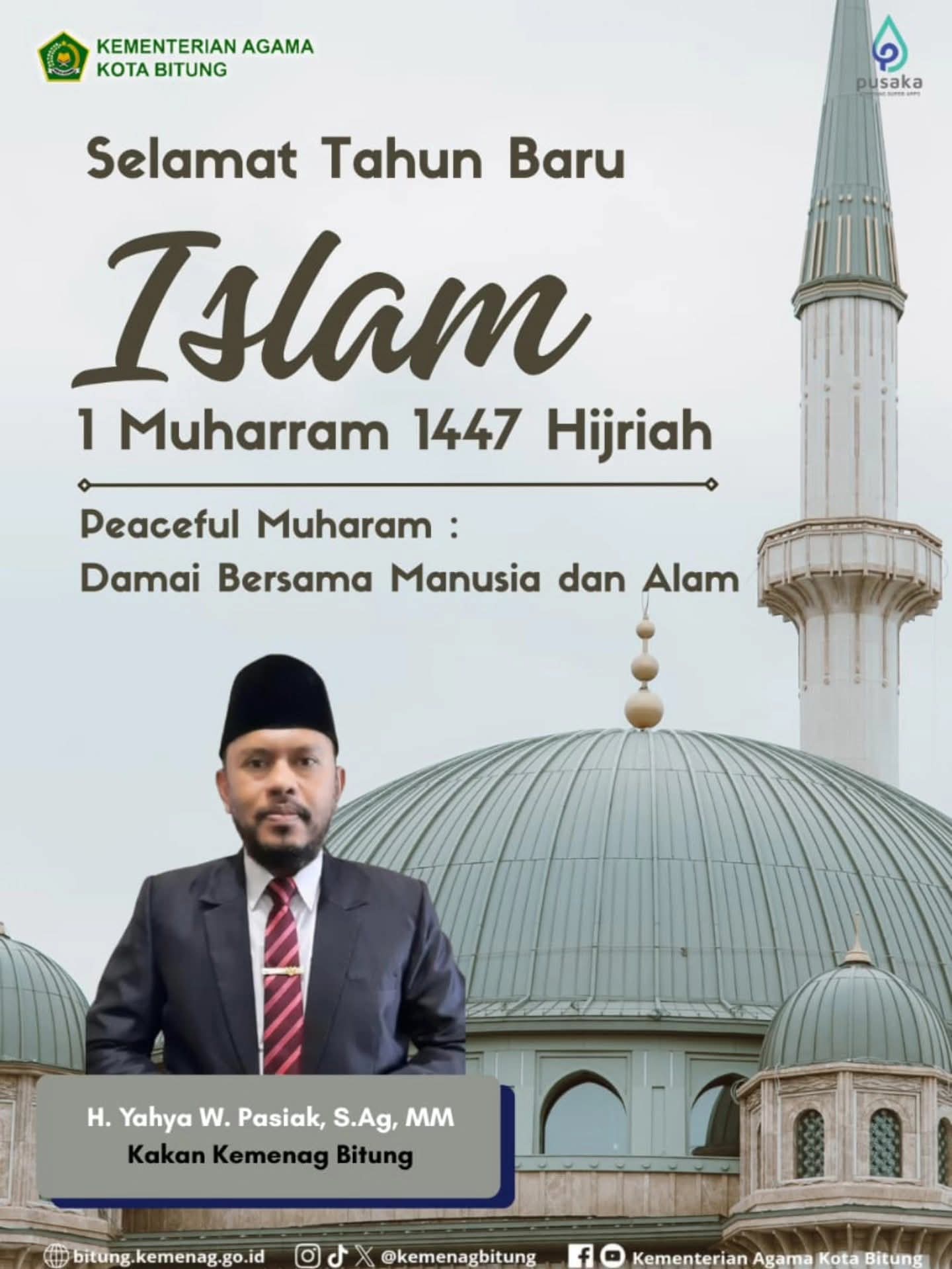 SuaraIntelijen.com.Bitung,Dalam rangka memperingati Tahun Baru Islam 1 Muharram 1447 Hijriah, Kepala Kantor Kementerian Agama Kota Bitung H Yahya W Pasiak S.ag MM menyampaikan ucapan selamat kepada seluruh umat Muslim di Kota Bitung dan sekitarnya,Jumat (27/6/2025).