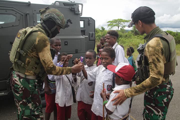 SuaraIntelijen.com.Nduga,Satgas Pamtas Mobile RI-PNG Yonif 503/Mayangkara melaksanakan Komunikasi Sosial bersama masyarakat serta memberikan permen dan motivasi singkat bagi anak – anak sekolah di Distrik Kenyam, Kabupaten Nduga Papua. Selasa(28/01/2025).