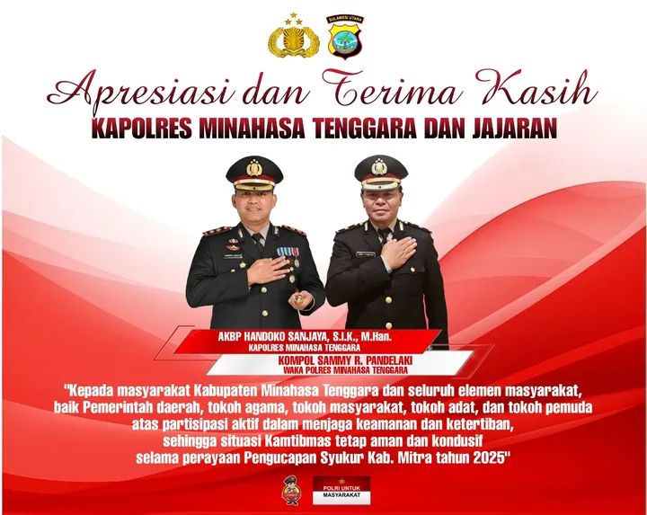 “Saya selaku Kapolres Mitra mengucapkan apresiasi dan terima kasih kepada masyarakat atas partisipasi aktif dalam menjaga keamanan dan ketertiban selama perayaan Pengucapan Syukur, sehingga situasi kamtibmas tetap aman dan kondusif,” ujar Kapolres.