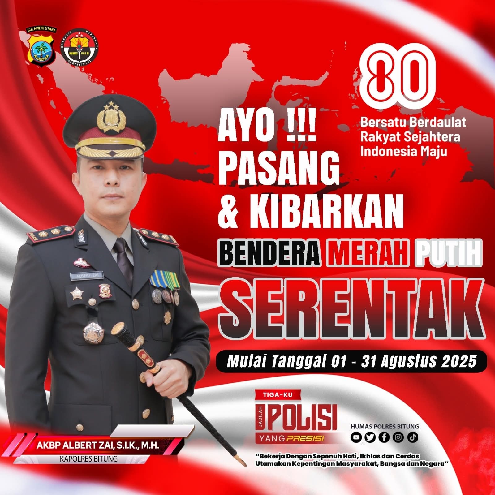 Ajakan tersebut disampaikan langsung oleh Kapolres Bitung, AKBP Albert Zai SH MH, melalui kampanye bertema “Ayo Kibarkan Bendera Merah Putih Serentak” yang dikemas dalam bentuk poster resmi dan disebarluaskan ke masyarakat.