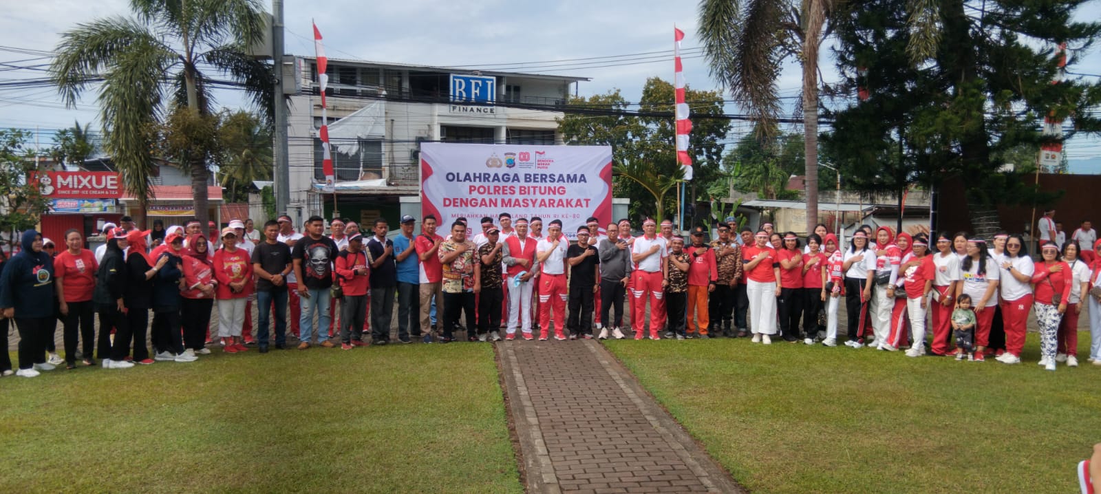 SuaraIntelijen.com.Bitung,Menyambut Hari Ulang Tahun (HUT) ke-80 Republik Indonesia, Polres Bitung menggelar kegiatan olahraga bersama masyarakat di Lapangan Apel Polres Bitung, Jumat (8/8/2025) pagi.