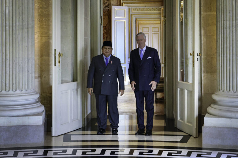 Tampak mendampingi Presiden Prabowo di Istana Laeken yaitu Sekretaris Kabinet Teddy Indra Wijaya dan Duta Besar Luar Biasa dan Berkuasa Penuh Republik Indonesia untuk Kerajaan Belgia Andri Hadi.