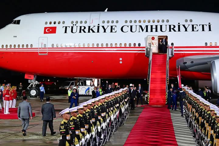 Setibanya di bawah tangga pesawat, Presiden Prabowo menyambut Presiden Erdogan dengan jabat tangan erat di tengah rintik hujan yang mengguyur Jakarta malam ini. Setelahnya, Presiden Erdogan beserta Ibu Emine Erdogan memberikan penghormatan sejenak kepada bendera Indonesia dan Turkiye yang dibawa oleh pasukan pembawa bendera.