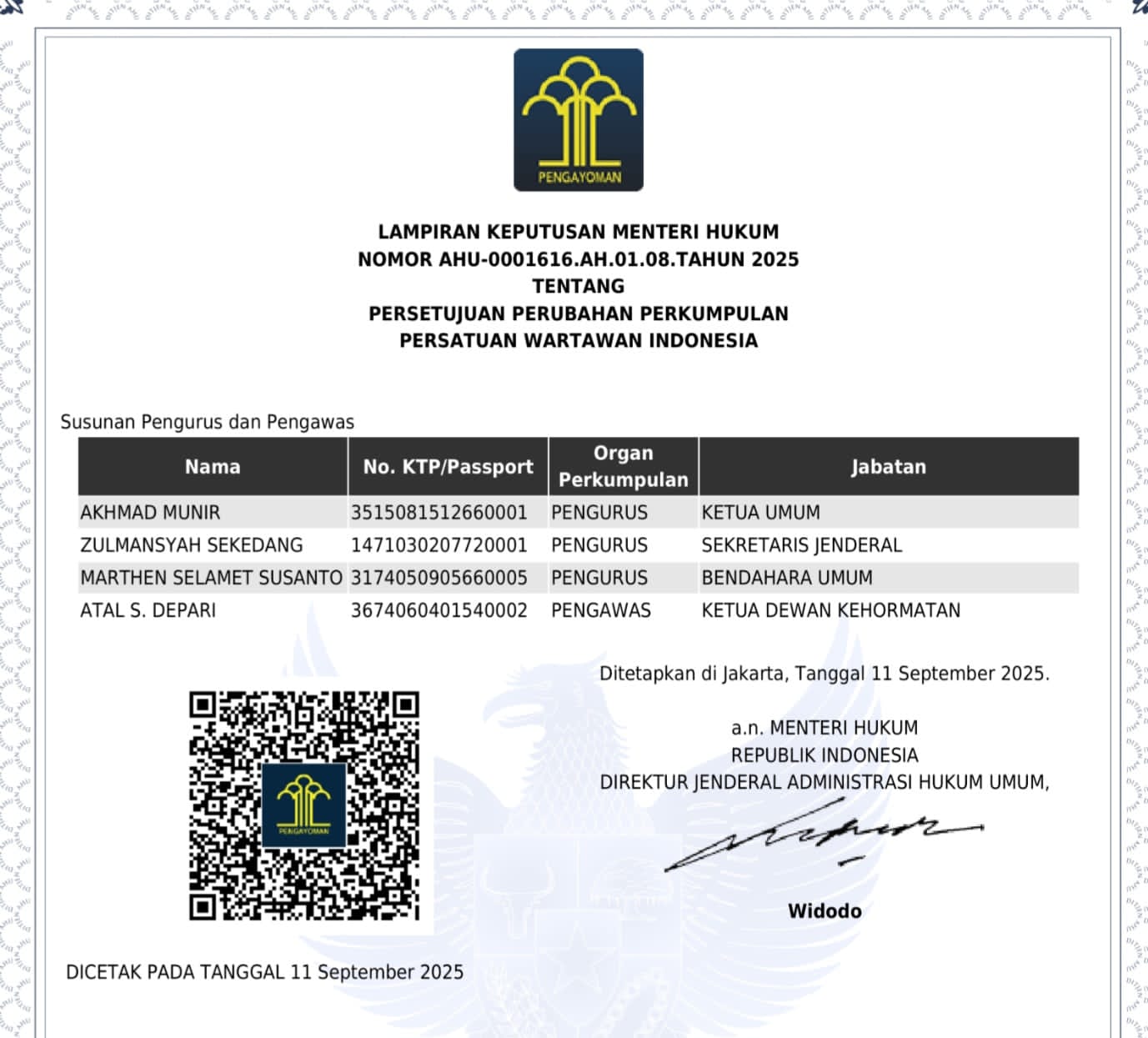 Penerbitan AHU ini berdasarkan permohonan PWI Pusat hasil Kongres Persatuan yang diajukan melalui Notaris Dwi Yantoro SH, MKn. Akta Nomor 02 tertanggal 10 September 2025 menjadi dasar perubahan badan hukum perkumpulan PWI yang kemudian disahkan dengan Nomor Pendaftaran 6025091131200080.