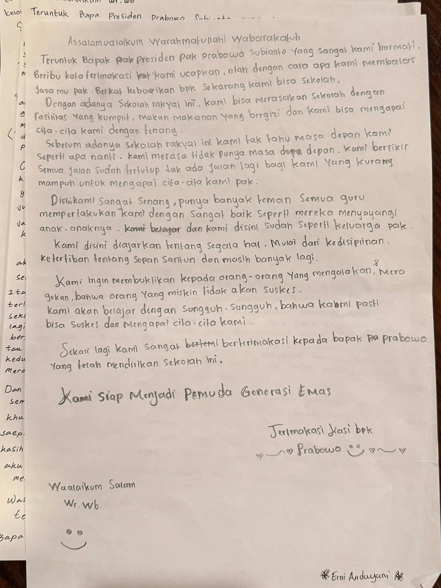 Menutup suratnya, Erni menyampaikan terima kasih kepada Presiden Prabowo dan menyatakan kesiapannya untuk menjadi generasi penerus bangsa untuk mewujudkan cita-cita Indonesia Maju.