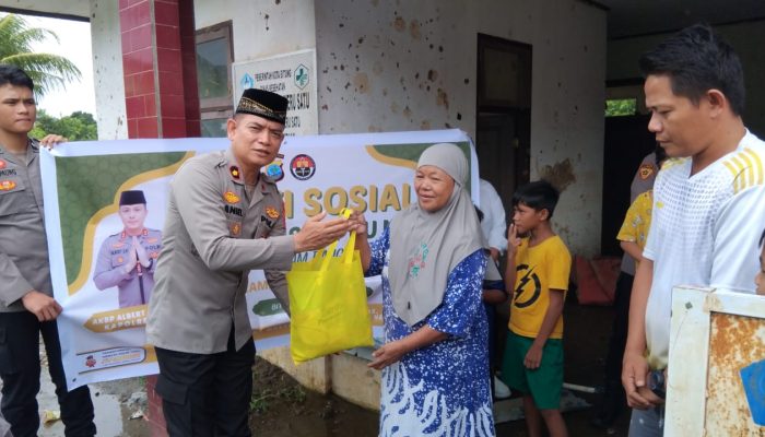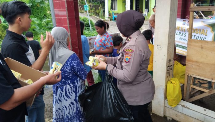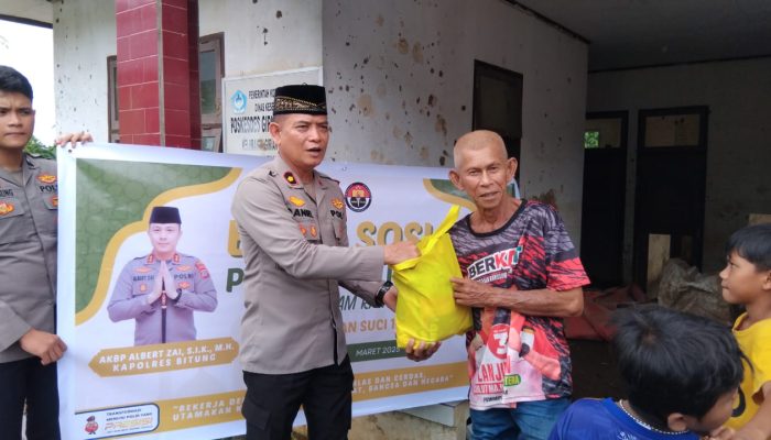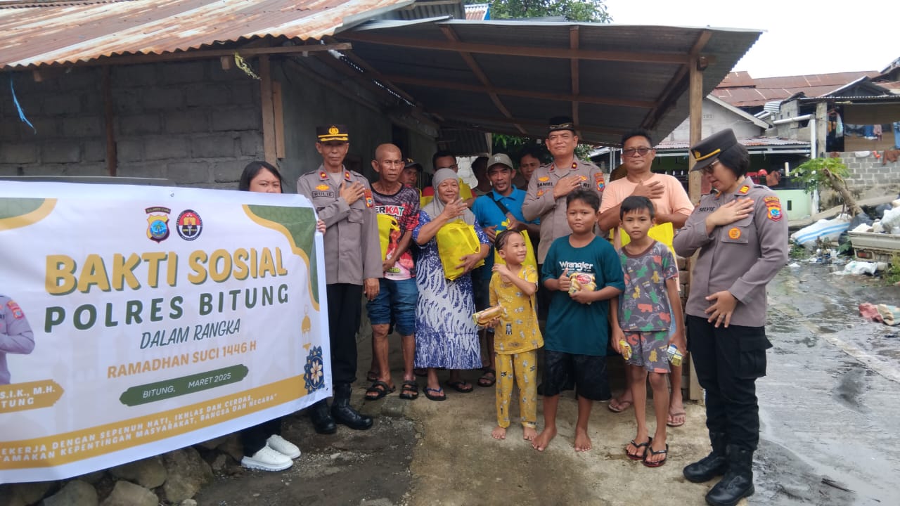 SuaraIntelijen.com.Bitung,Bertempat di Kelurahan Girian Weru Satu Kecamatan Girian Kota Bitung, Polres Bitung menyalurkan bantuan lewat Bakti Sosial, Senin (24/3/2025).
