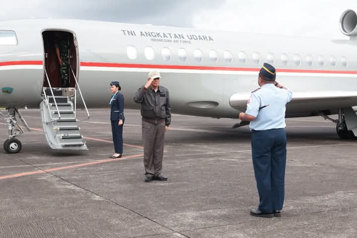 SuaraIntelijen.com.Manado,Tiba di Manado, Danlanud Sam Ratulangi Marsma TNI Antariksa Anondo, S.E., M. Tr. (Han)., beserta Forkopimda Sulawesi Utara menyambut kedatangan Menteri Pertahanan Republik Indonesia (Menhan RI) Bapak Sjafrie Sjamsoeddin bersama rombongan di Baseops Lanud Sam Ratulangi, Manado, Sulawesi Utara. Selasa (18/3/2025).
